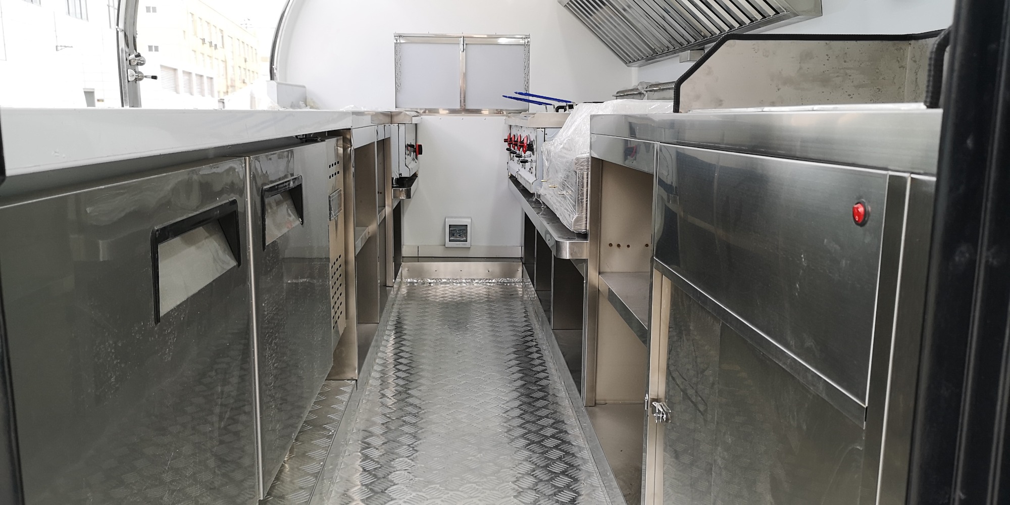 Sinks, 6 Power Sockets, Stainless Steel Table, Hoods,Gas Fryer, Gas Griddle, starry sky window , gas box,1500KG/AL-KO Brake System.